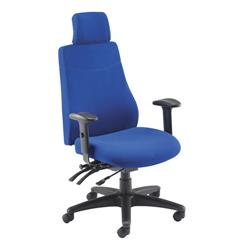 High back operator chair suitable for up to 24 hours use. Ideal for multi-shift environments. Asynchro tilt function to adjust seat and back. Seat slide and ratchet back. Adjustable arms included. Maximum sitter weight: 24 stone. Colour: Blue.