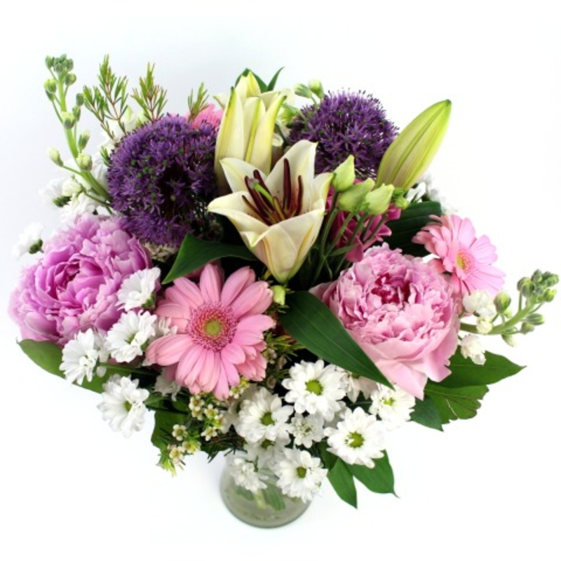 The subtle array of delicately splendid pink peonies & punchy violets of allium collaborate beautifully in this bouquet. Punctuated by fragrant oriental lilies & nestled within gerbera daisies, scented stocks, lisianthiums, santini chrysanthemums & waxflower.