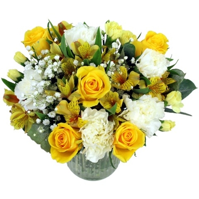 A warm and welcoming selection of blooms to make their day. Yellow roses, white carnations and lemon spray carnations are arranged with yellow patterned alstroemeria and delightful gypsophila.